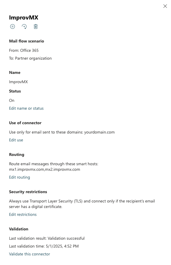 - Action: Configure a connector in Microsoft 365 to route emails for unknown recipients to ImprovMX.