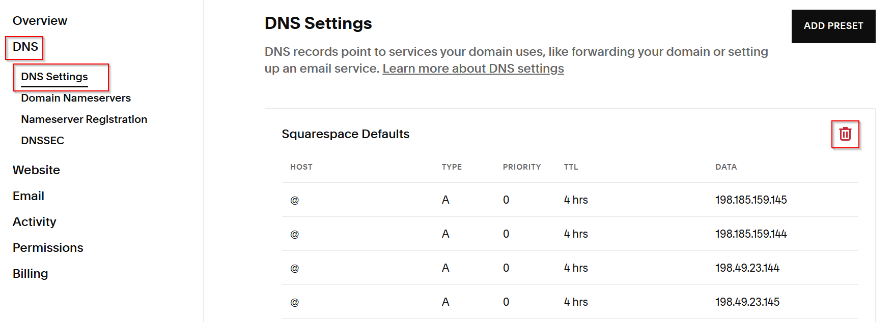 Select "DNS" -> "DNS Settings" -> Delete Squarespace default records.